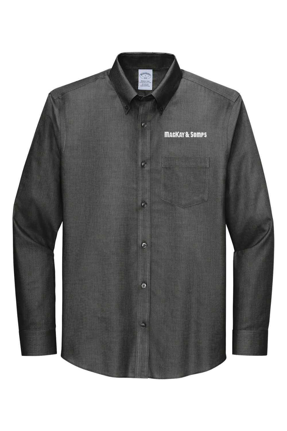 The Men’s Wrinkle-Free Stretch Nailhead Shirt combines a professional appearance with a business-casual aesthetic. It features a subtle two-color nailhead pattern and a soft texture, enhanced by a premium wrinkle-free treatment for all-day sharpness. Key details include a button-down collar, a left chest pocket, taped seams, dyed-to-match buttons sporting the Brooks Brothers logo, and rounded adjustable cuffs.